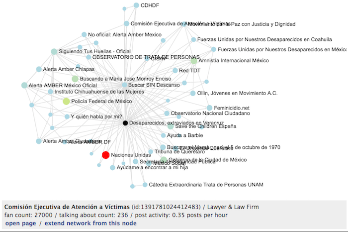El número de seguidores de páginas para encontrar a personas desaparecidas en México rebasa el millón en Facebook. Se trata de una red dispersa, que procede de distintas ciudades y no hay manera de encontrar criterios para identificarlas a partir de sus nombres, a lo que se suma la naturaleza de Facebook como una red cerrada, son características que dificultan conocer el número exacto de cuentas que participan en las búsquedas.