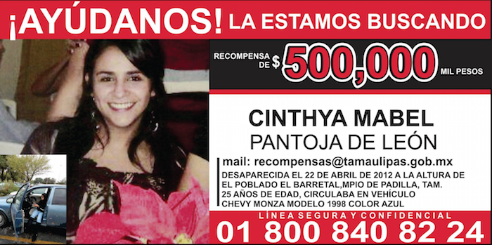 La fotografía de Cinthya se ha mantenido como portada de la página desde 2013 y su madre afirma que no la retirará de ahí hasta que aparezca. Junto a su retrato, en el que la joven esboza una sonrisa que contagia una empatía inmediata, se ofrece una recompensa de 500 mil pesos para quien proporcione información que ayude a dar con su paradero. La suma ha sido ofrecida por Procuraduría General de Justicia de Tamaulipas desde 2013 como parte de un programa para encontrar a los miles de desaparecidos que, en esa entidad, parecería que la tierra se los ha tragado.