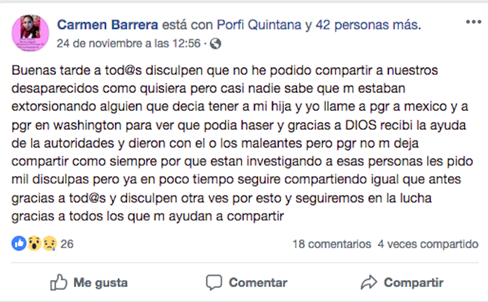 En los últimos ocho años, las redes de búsqueda han crecido en Twitter y Facebook pero con reservas. Josefina de León comentó a este medio que ha optado por ser selectiva con los grupos que al igual que ella buscan desaparecidos debido a que a través de las redes sociales el riesgo ha sufrir amenazas e intentos de extorsión es alto. Josefina es uno de los administradores de páginas que han recibido amenazas para que desista en sus búsquedas, e intentos de extorsionarla por parte de personas que han condicionado la proporción de supuesta información para dar con el paradero de su hija.