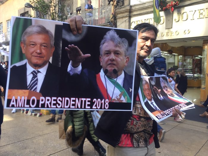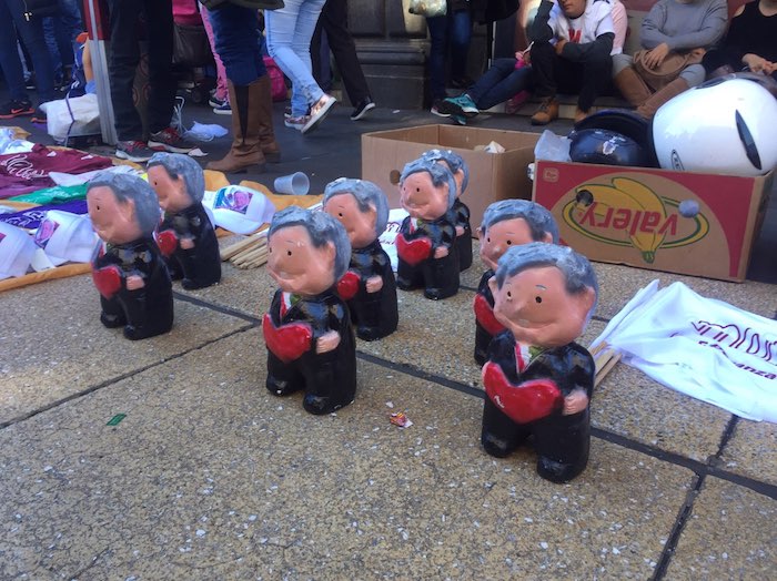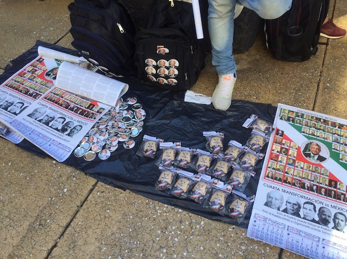 Como en el concierto que es, abundan puestos con playeras, muñecos, gorras, paraguas, banderas, alcancías, máscaras, calendarios... todo de la imagen del nuevo Presidente de México, portado por los entusiastas asistentes.