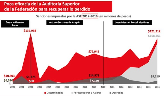 Sobre este órgano fiscalizador, el investigador Marco Fernández destacó que en 2016 determinó desvíos por 121 mil 212 millones de pesos, pero hasta ahora las recuperaciones han sido de sólo 9 mil 119 millones.