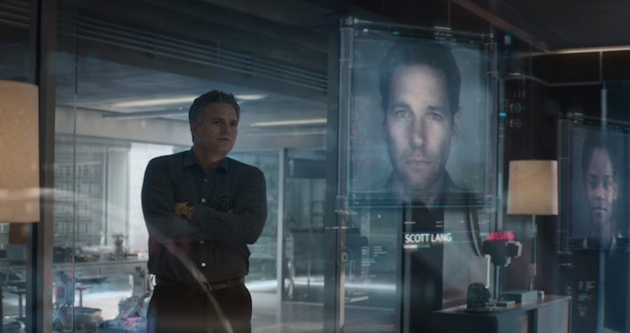 En el tráiler se puede ver una escena en la que Bruce Banner está en un laboratorio mirando las fotos de sus amigos que han sido considerados "desaparecidos" después del chasquido de Thanos. En esa imagen se puede ver cómo aparecen las fotografías de Scott Lang y Peter Parker con sus nombres y al lado la palabra "desaparecido".