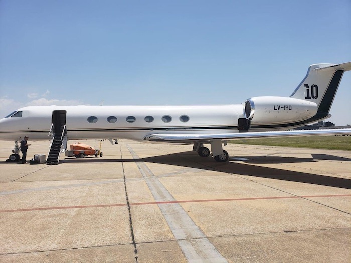 Se trata de una aeronave de gran tamaño y de largo alcance Gulfstream V del año 2004. En la cola del avión se puede observar el número 10, dorsal de 'la Pulga' en el club catalán y la selección argentina.