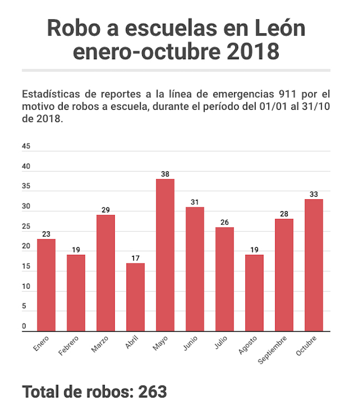 De acuerdo con un reporte del Centro de Comando, Control, Comunicaciones y Computo (C-4), del 1 de enero al 31 de octubre de este año, solicitado a través de acceso a la información, policías municipales atendieron en al menos 263 ocasiones casos de robo a escuelas públicas en la ciudad de León.