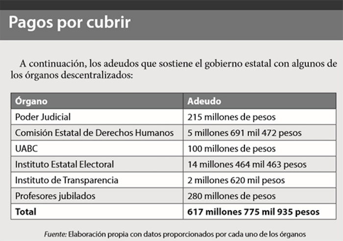 A este escenario se suman los adeudos por encima de los 609 millones de pesos que el gobierno estatal sostiene, con órganos descentralizados como el Poder Judicial, la Comisión Estatal de Derechos Humanos, la Universidad Autónoma de Baja California, el Instituto Estatal Electoral, el Instituto de Transparencia, Cecyte, Cobach e incluso a profesores jubilados.