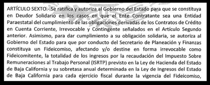 En su Artículo Sexto, el decreto indica que “se autoriza al Gobierno del Estado para que por conducto del Secretario de Planeación y Finanzas constituya un fideicomiso, afectando y/o destine en forma irrevocable la totalidad de los ingresos por la recaudación del Impuesto Sobre Remuneraciones al Trabajo Personal (ISRTP) y su sobretasa anual para cada ejercicio fiscal durante la vigencia del Fideicomiso”.