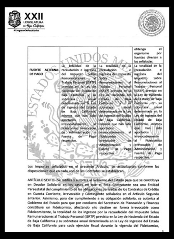 Este decreto, en el que se detallan las garantías y formas de pago para un conjunto de APPs destinadas al agua como la desalinizadora de Playas de Rosarito, tuberías de agua potable y drenaje en Mexicali y Ensenada y la planta potabilizadora La Nopalera, establece que el Impuesto Sobre la Nómina puede ser destinado en su totalidad a estos fines.