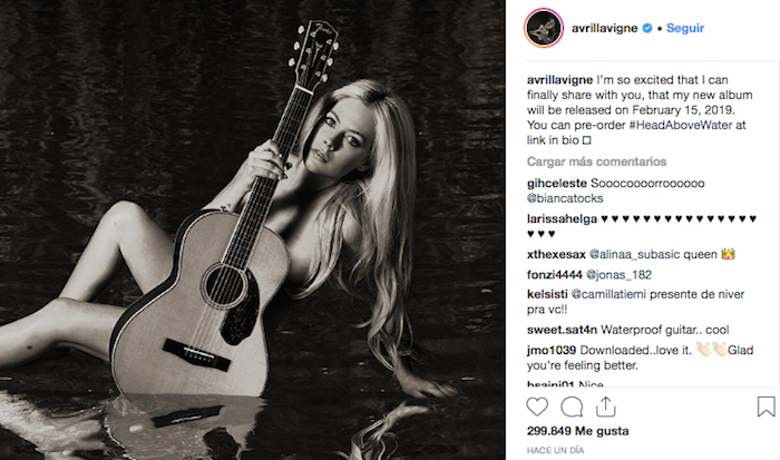 Ciudad de México, 13 de diciembre (LaOpinión/SinEmbargo).- “Estoy tan emocionada de poder finalmente compartir con ustedes que mi nuevo álbum se lanzará el 15 de febrero de 2019”, escribió Avril Lavigne en Instagram junto a una fotografía en blanco y negro en donde aparece desnuda y únicamente cubierta por una guitarra. La nueva producción discográfica de la canadiense llevará por nombre “Head Above Water”, el cual será el quinto disco de estudio, de la cantante que conoció la cima en el año 2012 gracias al impacto que tuvo su tema “Complicated”.
