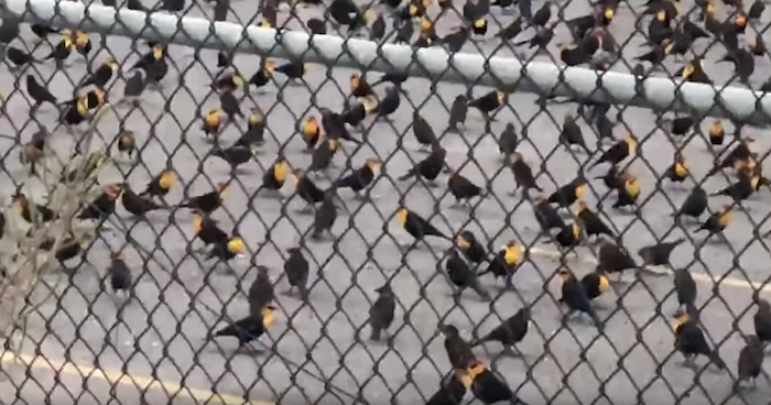 “No lo podemos creer. ¡Hay miles y miles de pájaros pecho amarillo! Miren qué hermoso”, dice la mujer que graba atónita este acontecimiento y agrega que “es todo un espectáculo”.