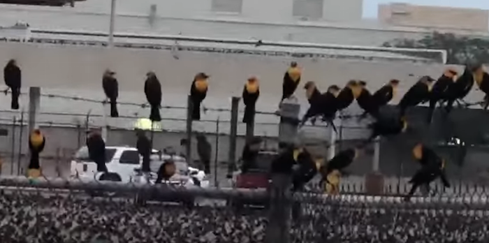 El video muestra a las aves que posan sobre el concreto, el enrejado de la planta automotriz y el cableado telefónico; otras más, sobrevuelan el lugar.