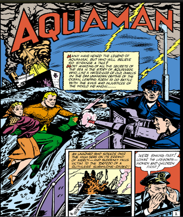 En la lista elaborada por Nerdist no podía faltar su primera aparición en los cómics de DC. Aunque no es el protagonista único, su debut coincide con el de otro compañero suyo en la Liga de la Justicia, Green Arrow. En 'The Submarine Strikes!' se puede ver un breve resumen del origen del superhéroe, que inicialmente fue muy diferente que el que tiene en la actualidad, al tener sus poderes gracias a que su padre utilizó cien secretos científicos para permitirle extraer oxígeno del agua y tener poderes de velocidad, fuerza y telepatía. El traje con el que debutó no cambió durante 45 años.