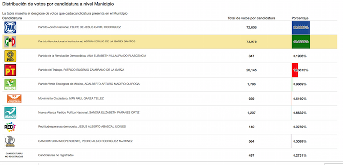 Con 62.75 por ciento de las actas contabilizadas, De la Garza obtuvo 40.65 por ciento de los votos frente al 39.89 por ciento de Felipe de Jesús Cantú, candidato del PAN, de acuerdo con datos de la Comisión Estatal Electoral (CEE).