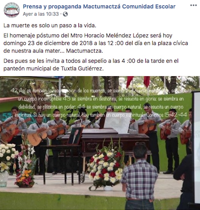 “Sabemos que destacó más allá del salón de clases, defendió con entrega total a la institución. Hoy, su figura se glorifica, tenías muchas ilusiones. Tu imagen dificil de igualar se quedará por siempre en la memoria de la Mactumatzá”.