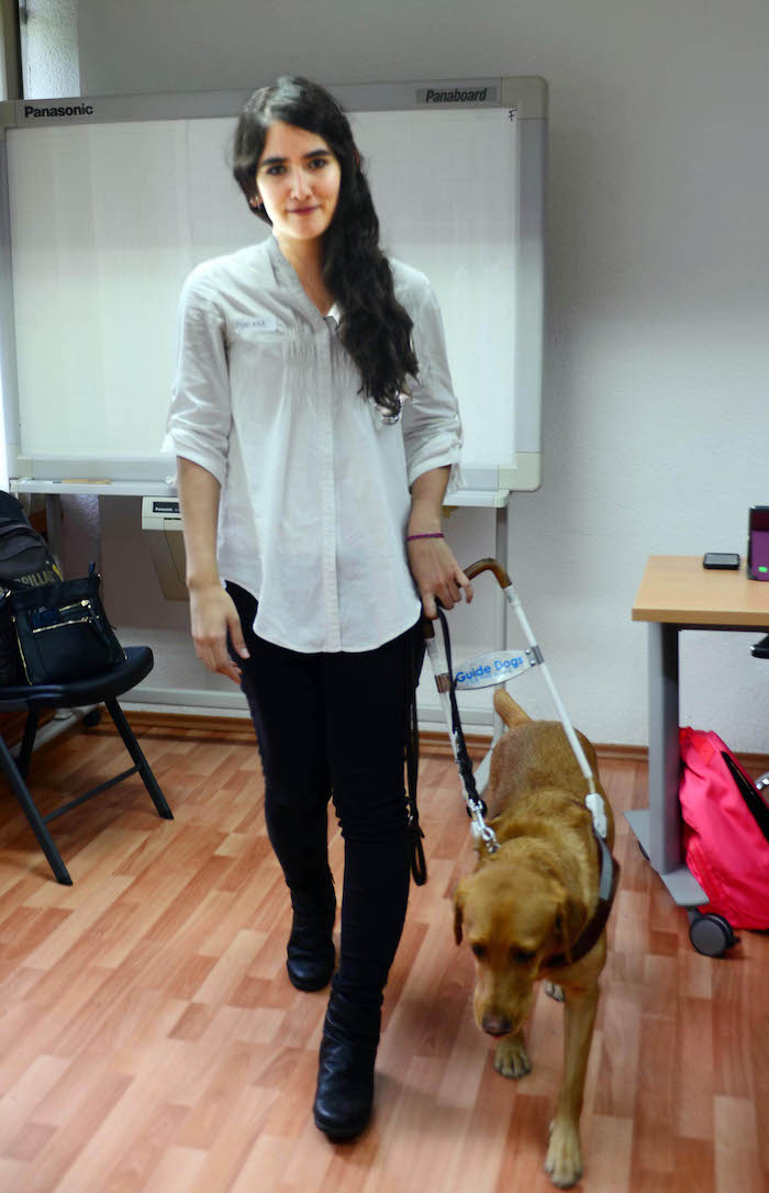 La perrita de raza labrador retriever fue entrenada en San Rafael, California, para ayudar a personas como Karla Mariana, quien sufre de baja visión, a caminar de manera segura, cruzar calles y evitar barreras u obstáculos que la pongan en peligro.