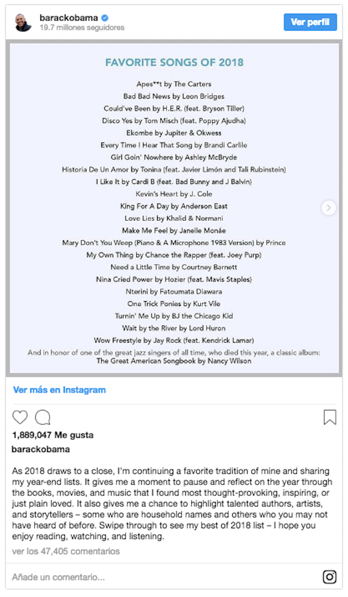 La publicación iba acompañada de este mensaje: “A medida que el 2018 llega a su fin, sigo con una de mis tradiciones favoritas y comparto mis listas de fin de año. Me da un momento de dar una pausa y reflexionar sobre el año a través de los libros, las películas y la música que me parecen más inspiradoras, estimulantes o simplemente amadas".