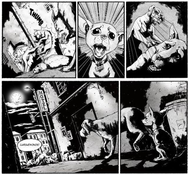 Sin embargo, el documentalista y realizador Manuel H. Martín quería narrar un western crepuscular sobre dos perros que se ayudaban mutuamente para hacer frente a su destino en la calle. Tras dirigir proyectos tan distintos como La vida en llamas y el impresionante documental animado 30 años de oscuridad, se aventura en el mundo del cómic con Una historia de perros viejos, publicado por Dolmen Editorial. Y lo hace con la ayuda del ilustrador Juanma Espinosa, que aporta un trazo oscuro y ambientación propia del cine negro. El resultado es un cómic que recuerda a propuestas revitalizantes del cómic noir contemporáneo como La escena del crimen, a la vez que alude al imaginario del oeste de Blueberry.