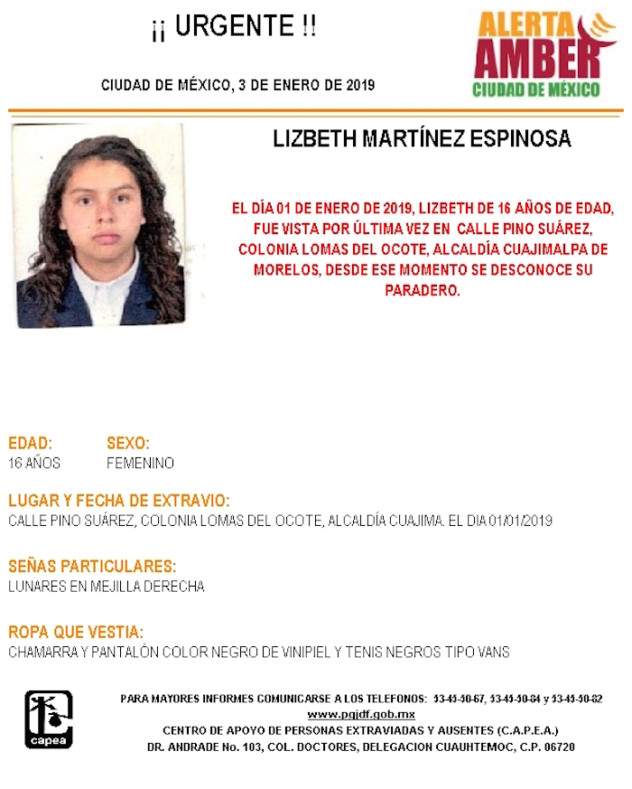 Lizbeth Martínez Espinosa, de 16 años de edad, fue vista por última vez el el 1 de enero, en la calle Pino Suárez, colonia Lomas del Ocote, alcaldía Cuajimalpa de Morelos.