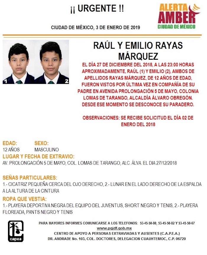 Los hermanos Raúl y Emilio Rayas Márquez, ambos de 12 años, desaparecieron el pasado 27 de diciembre en la avenida Prolongación 5 de Mayo, colonia Lomas de Tarango, alcaldía Álvaro Obregón.