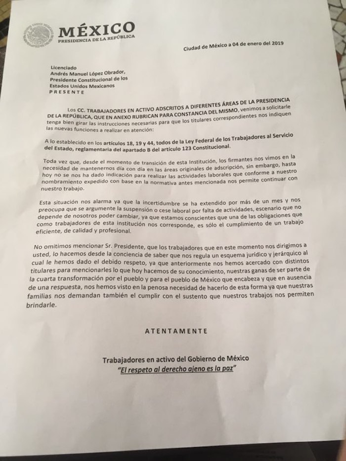 "Nos hemos acercado con distintos titulares para mencionarles lo que hoy hacemos de su conocimiento, nuestras ganas de ser parte de la cuarta transformación por el pueblo y para el pueblo de México que encabeza y que en ausencia de una respuesta nos hemos visto en la penosa necesidad de hacerlo de esta forma ya que nuestras familias nos demandan también el cumplir con el sustento que nuestros trabajos nos permiten brindarle", indicaron.