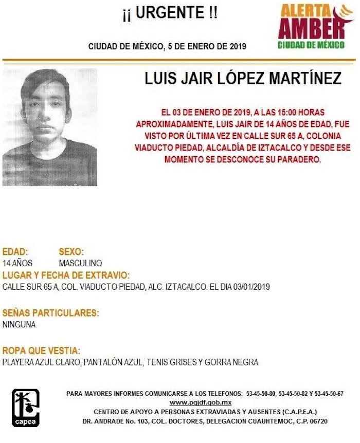 Luis Jair López Martínez, de 14 años, desapareció el pasado 3 de enero alrededor de las 15 horas. "Fue visto por última vez en la calle Sur 65 A, colonia Viaducto Piedad, en la alcaldía Iztacalco", señala la PGJE-CdMx.