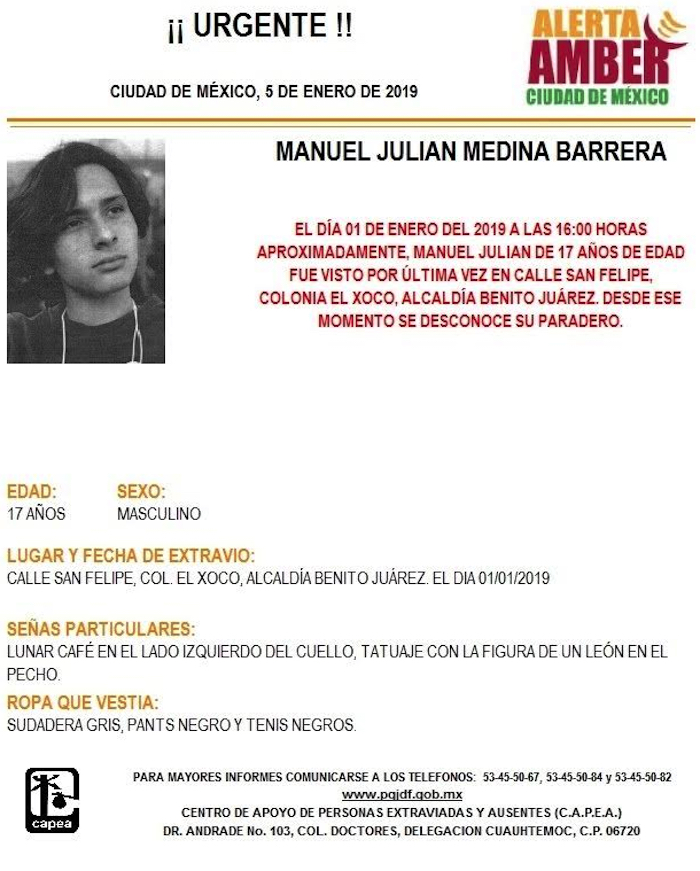 De 17 años, Manuel Julian Medina Barrera desapareció el pasado primero de enero alrededor de las 16:00 horas. Se encontraba en la alcaldía Benito Juárez cuando se le vio por última vez en la calle San Felipe, de la colonia Xoco.