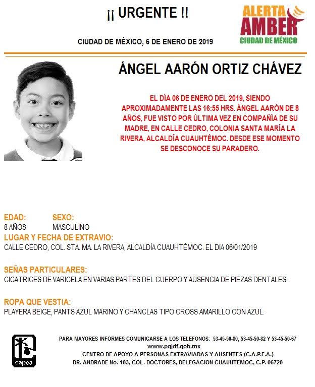 Ciudad de México, 7 de enero (SinEmbargo).- La Procuraduría General de Justicia de la Ciudad de México (PGJE-CdMx) ha emitido en las últimas 12 horas dos nuevas Alerta Amber para la localización del pequeño Ángel Aarón Ortiz Chávez, de 8 años de edad y Carlos Gabriel Ruiz Herrera, de 16 años, desaparecidos en la Alcaldía Cuauhtémoc y Tlalpan, respectivamente.