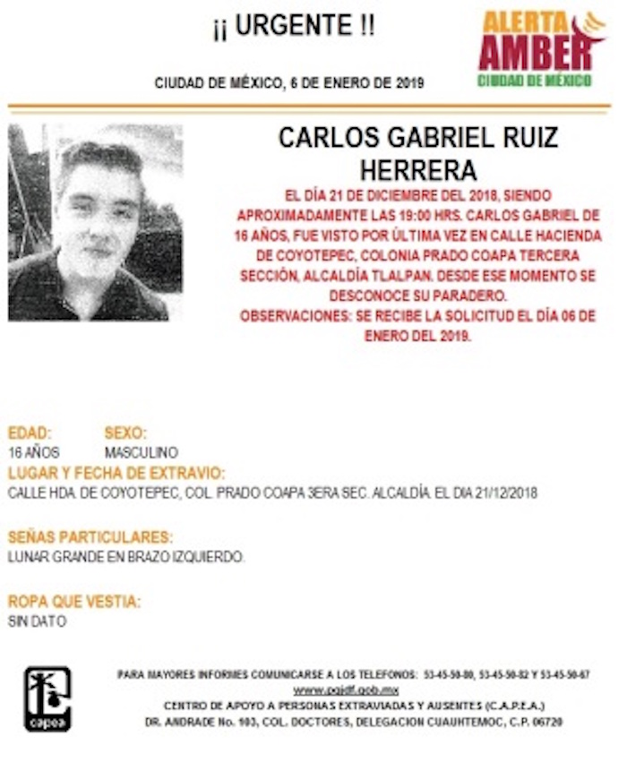 Carlos Gabriel Ruiz Herrera, de 16 años, desapareció desde hace 17 días. El menor fue visto por última vez alrededor de las 7 de la tarde del pasado del 21 de diciembre del 2018 en la Calle Hacienda de Coyotepec, Colonia Prado Coapa Tercera Sección, alcaldía Tlalpan.