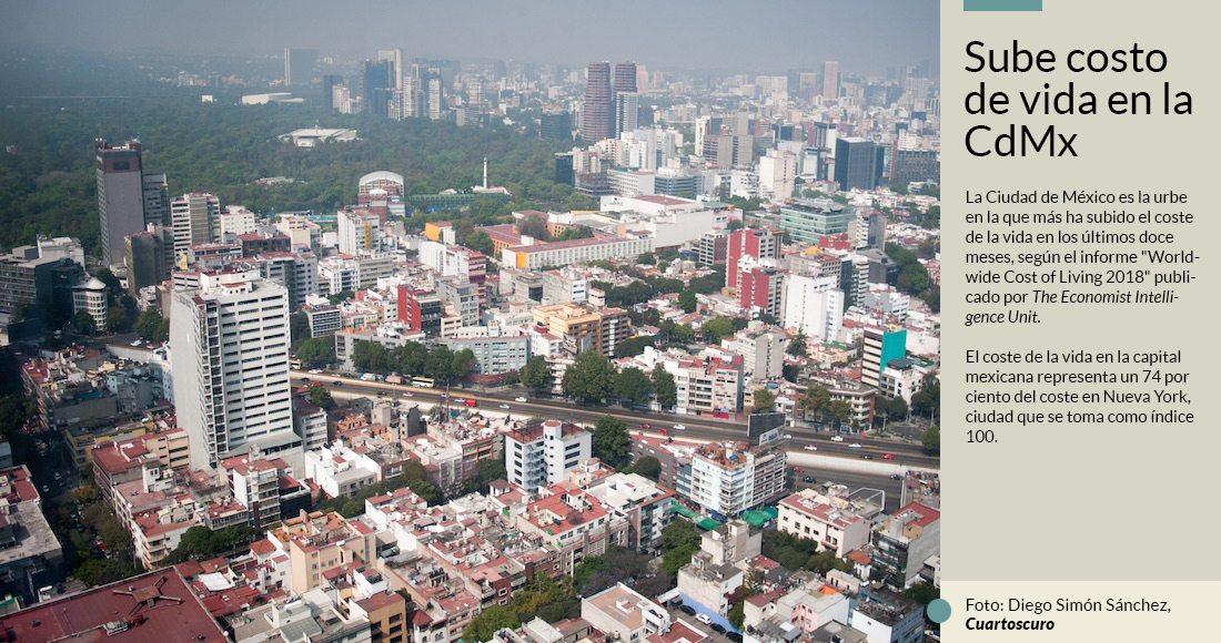 De acuerdo con el informe “Worldwide Cost of Living 2018” publicado por The Economist Intelligence Unit, la Ciudad de México ha sido la ciudad en la que más ha subido el costo de la vida entre 2017 y 2018. Otra ciudad sudamericana, Santiago de Chile, y San Petersburgo completan el podio.
