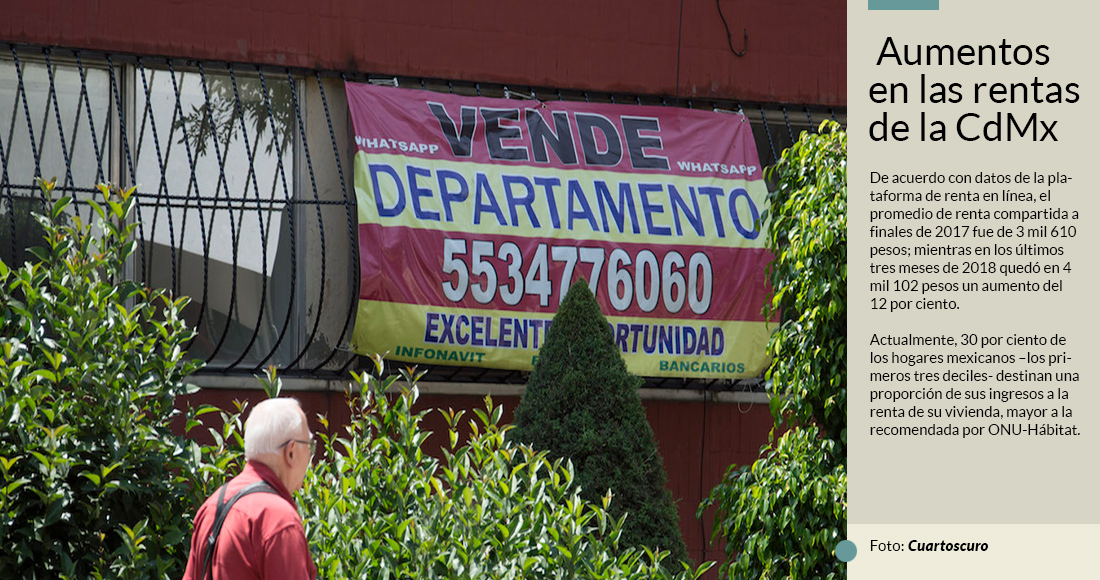 De acuerdo con datos de la plataforma de renta en línea, el promedio de renta compartida a finales de 2017 fue de 3 mil 610 pesos; mientras en los últimos tres meses de 2018 quedó en 4 mil 102 pesos un aumento del 12 por ciento. Un estudio realizado por el Coneval revela que sólo aquellos que ganan más de cinco salarios mínimos pueden adquirir una casa, por lo que 73.6 millones de mexicanos están excluidos del mercado formal de vivienda.
