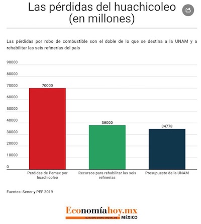 Ciudad de México, 14 de enero (EconomíaHoy/SinEmbargo).- Las pérdidas de Petróleos Mexicanos (Pemex) derivadas del robo de combustible, también conocido como huachicoleo, ascienden hasta los 70,000 millones de pesos, esto es dos veces los recursos destinados en este 2019 a la Universidad Autónoma de México (UNAM), que recibirá 34 mil 778 millones de pesos.