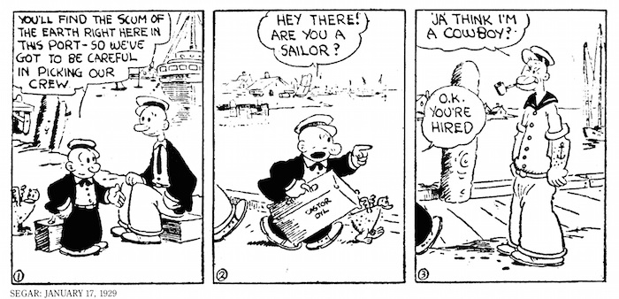 El famoso marino aparecía inicialmente como un tipo que fue contratado por Olivia Olivo, que viajaba junto con su hermano Castor y su novio Harold Hamgravy, para ayudarle a encontrar a una gallina mágica. Pese que el personaje estaba pensado para ser temporal, tal fue su popularidad que Popeye pasó a protagonizar la tira cómica que acabó llevando su nombre.