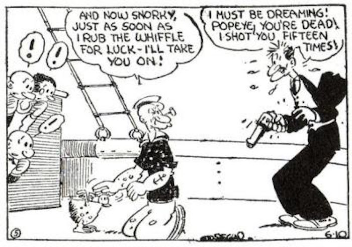 Según Bill Blackbeard, en su artículo 'The First (arf, arf!) Superhero of Them All', que apareció en el libro All in Color for a Dime, editado por Dick Lupoff y Don Thompson en 1970, a Popeye se le puede considerar un precursor de los superhéroes. Antes de que Superman o el Capitán América dominasen los cómics, estuvieron el marino y sus espinacas.