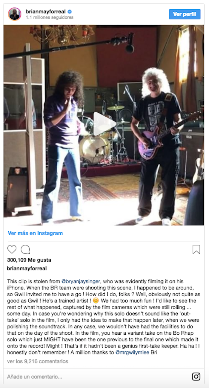En el clip en cuestión, May toca el solo en un estudio de grabación ante Gwilym Lee, el actor encargado de interpretarle a él en la película -quien, por cierto, queda alucinado por lo que acaba de vivir-. Al fondo se ve también a Rami Malek caracterizado como Freddie Mercury.