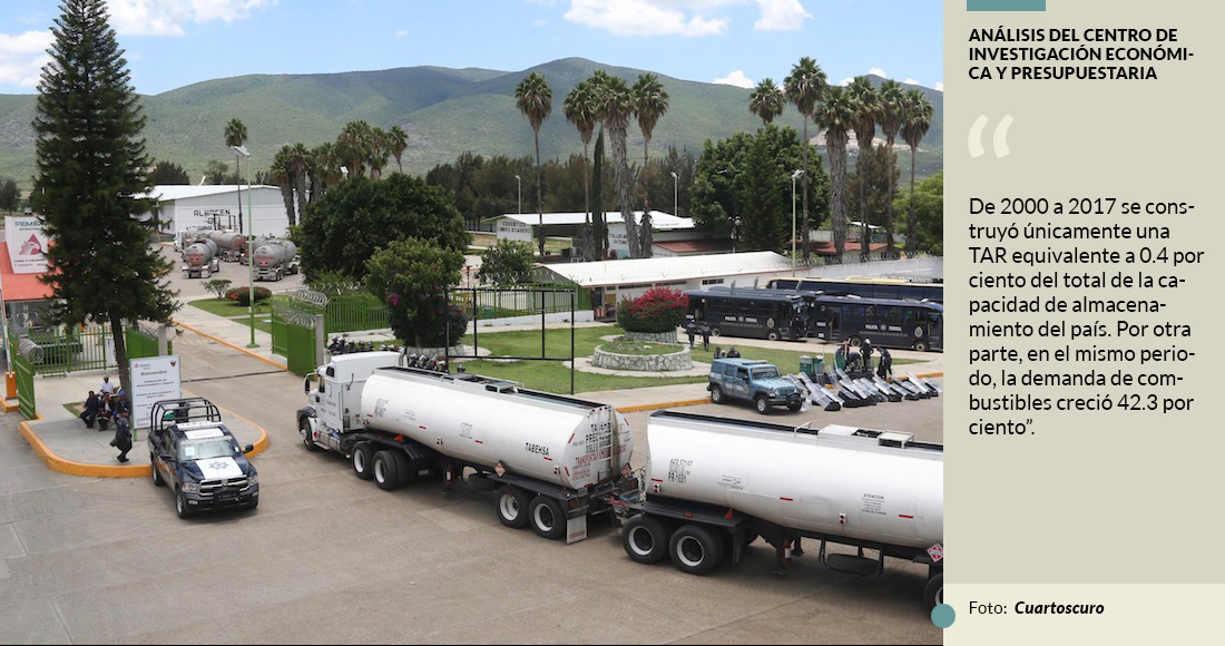 De 2000 a 2017 (los últimos tres sexenios) se construyó únicamente una Terminal de almacenamiento y Reparto en Pemex, mientras que la demanda de combustibles creció 42.3 por ciento, informó el Centro de Investigación Económica y Presupuestaria. Reveló que el nivel de almacenamiento recomendado por la Agencia Internacional de Energía es tener como mínimo una capacidad de hasta 21 días. Sin embargo, en México es de 7.5 días para gasolinas y 6.9 para el diésel.