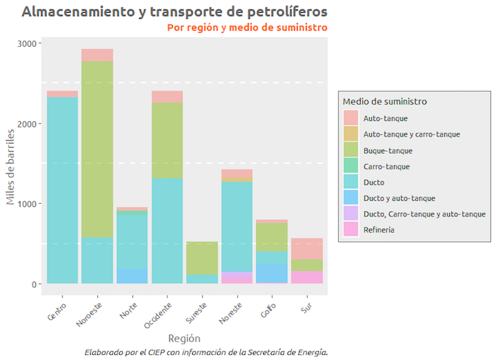 De acuerdo con el CIEP, la infraestructura de petrolíferos (gasolinas, diésel, turbosina, gas licuado de petróleo, entre otros) puede analizarse desde dos áreas: almacenamiento y transporte. Actualmente, las 73 TAR que hay en México suman una capacidad operativa de 11 millones 971 mil 619 barriles, mismos que son transportados en 3/4 (76 por ciento) por ductos.