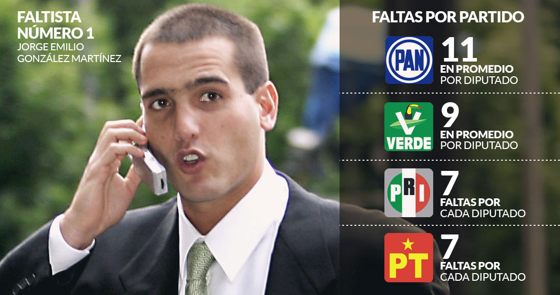 Pero el Diputado del Partido Verde Jorge Emilio González Martínez, mejor conocido como “El Niño Verde”, se lleva las palmas. Fue el que más inasistencias tuvo: faltó a 40 de 44 votaciones. González no tuvo necesidad de solicitar un sólo voto en las calles para las elecciones del pasado 1 de julio: se hizo Diputado federal gracias a que estaba en la lista de plurinominales de su partido.