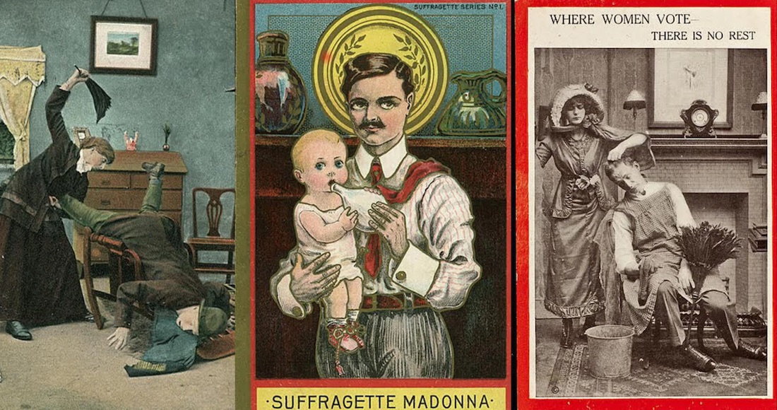 Estas postales de Estados Unidos y Reino Unido de inicios del siglo XX, fueron circuladas y publicadas con el fin de distanciar a hombres y mujeres por igual de la idea de la inclusión a la esfera pública de la mujer. No lo lograron, pero son un firme recordatorio de que el trabajo que hay por hacer por el reconocimiento de derechos civiles es continuo y que existe una temible atemporalidad en cuanto a los prejuicios de las capacidades de la mujer.