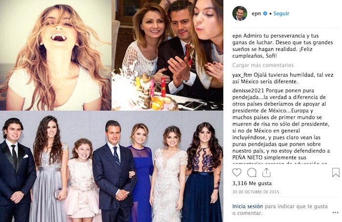 En el ocaso de su sexenio, la cuenta de Instagram del Presidente Enrique Peña Nieto interactuó con sus miles de seguidores y felicitó por sus cumpleaños a sus seis hijos, de quienes dice estar muy orgulloso. Ellos, además de posar en revistas del corazón como Quién, ¡Hola!, Marie Claire o Caras, también usaron las redes sociales para compartir su ropa de marcas exclusivas y viajes al extranjero vigilados por el Estado Mayor Presidencial, lo que ha afectado la imagen política del priista ante la opinión pública de México, un país donde la mitad de sus habitantes vive en la miseria y los índices de violencia han aumentado, así lo plantearon analistas de imagen y comunicación estratégica.
