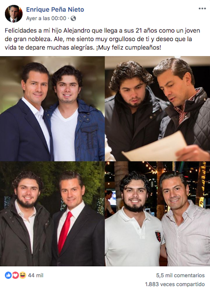 "Felicidades a mi hijo Alejandro que llega a sus 21 años como un joven de gran nobleza. Ale, me siento muy orgulloso de ti y deseo que la vida te depare muchas alegrías. ¡Muy feliz cumpleaños!", escribió el ex mandatario.