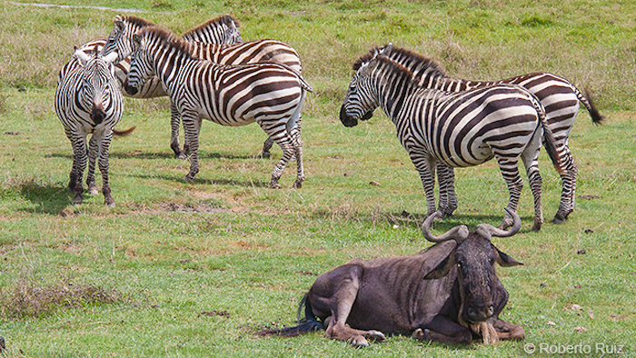Cebras y ñus descansas a un lado y a otro de los caminos. Foto: Roberto Ruiz, ElDiario.es