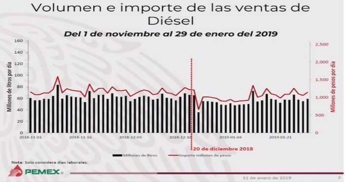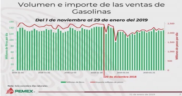 Para la última quincena de enero, en comparación con 2018, hubo un porcentaje de cumplimiento del 94 por ciento en la venta de millones de litros por día. Para la última semana del mes, en comparación con el mismo periodo de 2018, el cumplimiento fue de 97 por ciento.