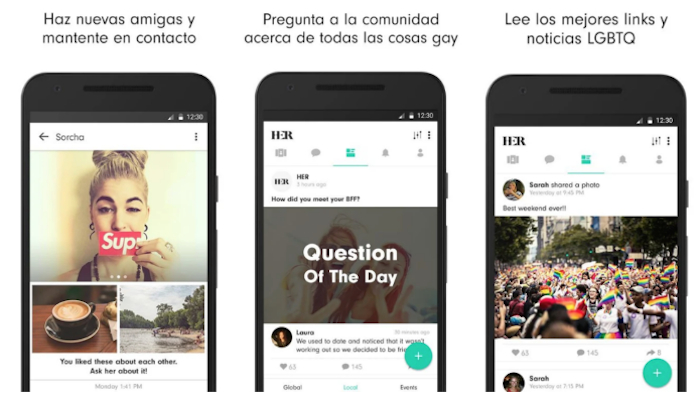 Esta app está enfocada en la comunidad LGBTQ de todo el mundo; además no sólo funciona para citas sino también para relaciones de amistad, hay chats grupales y permite conocer información sobre eventos, artículos o contenido que pueda interesar a sus usuarios. En su descripción se puede leer "Rodéate de increíbles nuevas amigas lesbianas, ve a citas, encuentra eventos LGBTQ cerca de ti o sólo chatea. Her es el lugar ideal para todas las cosas gay".