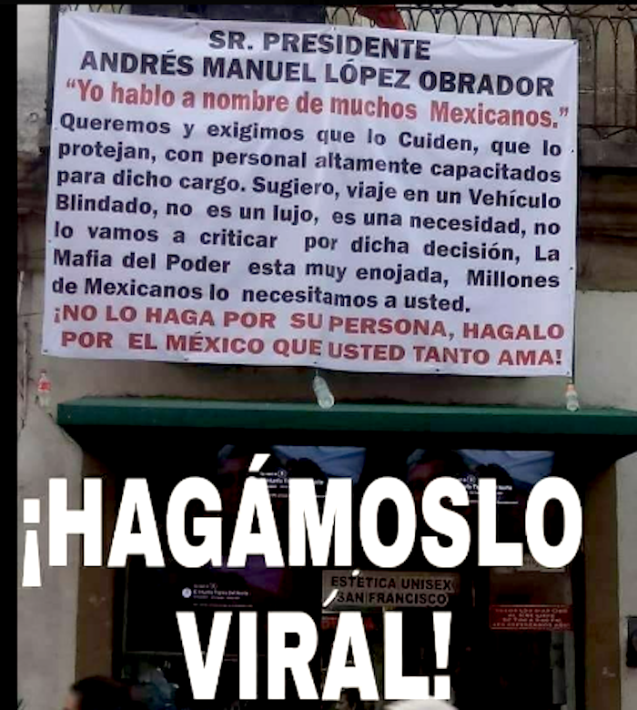 "Sr. Presidente Andrés Manuel López Obrador Yo hablo a nombre de muchos mexicanos, queremos y exigimos que lo cuiden, que lo protejan, con personal altamente capacitados para dicho cargo. Sugiero, viaje en un vehículo blindado, no es un lujo, es una necesidad, no lo vamos a criticar por dicha decisión. La mafia del poder está muy enojada, millones de mexicanos lo necesitamos a usted. ¡No lo haga por su persona, hágalo por el México que usted tanto ama!", se expresó en algunas de las mantas que lo llamaron directamente a reforzar su seguridad personal.