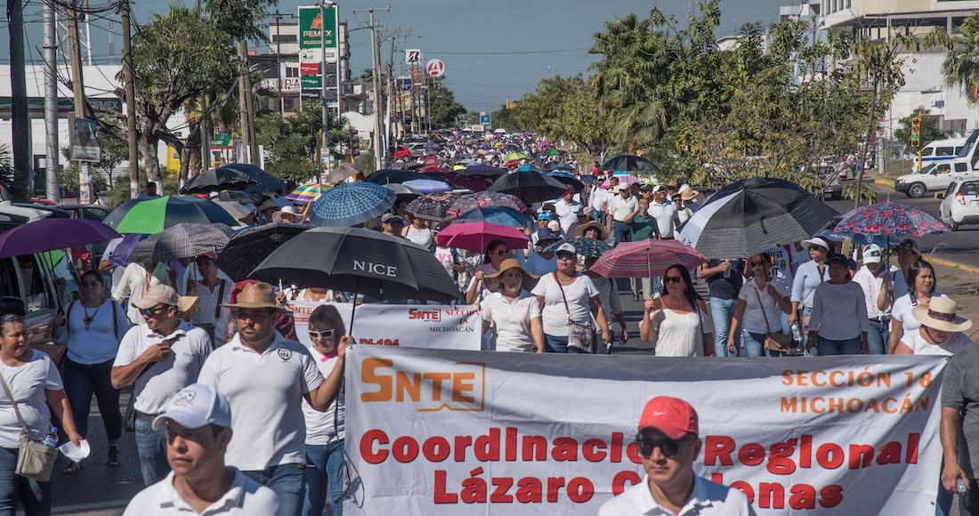 De acuerdo con medios locales, alrededor de mil profesores participaron en la movilización que partió del Instituto Tecnológico de Lázaro Cárdenas y concluyó frente al Palacio Municipal.