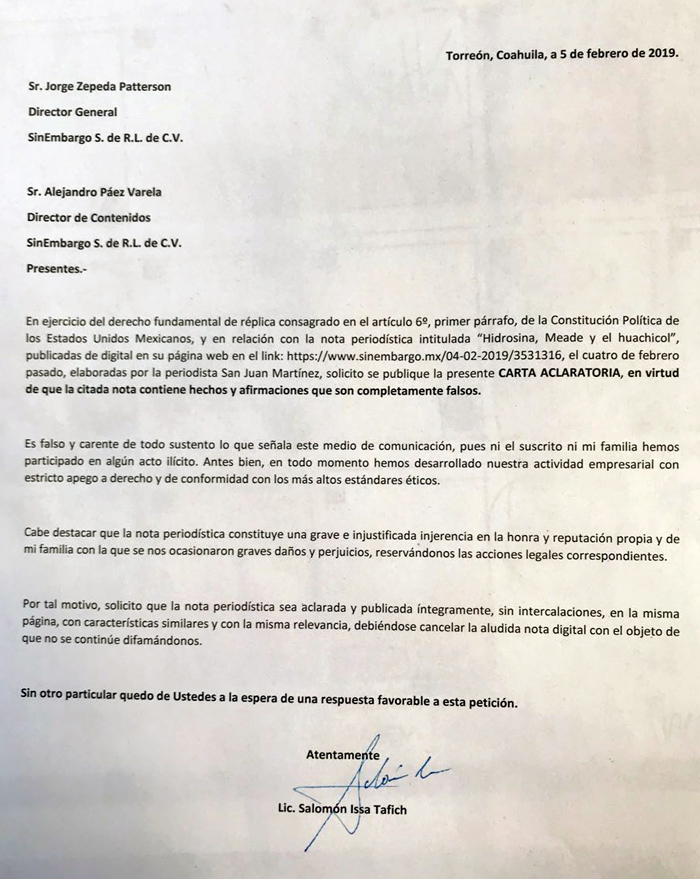 Con fecha del 5 de febrero, el viernes 15 del mismo mes, por la noche, llegó a la redacción de SinEmbargo una carta firmada por Salomón Issa Tafich en relación a este texto. Se solicitó su publicación y en atención a ese derecho se publica íntegra, como llegó, en este mismo espacio:
