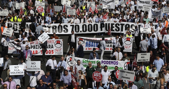 Centenares de conductores que trabajan para empresas como Uber y Cabify marchan durante una protesta contra los planes del gobierno de imponer normas que limitarán el funcionamiento de taxis solicitados o contratados mediante aplicaciones en celular. Foto: AP