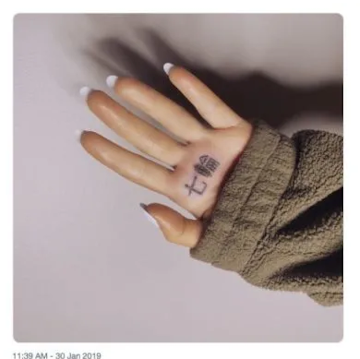 ¿El tatuaje del que todos hablan? Uno que la famosa se hizo en la mano izquierda inspirado en su nueva canción. Y aunque "7 Rings" era lo que supuestamente debía de decir en kanji japoneses, sus fans de inmediato notaron que había una falla en éste, convirtiéndolo en la palabra shichirin, la cual significa pequeña parrilla de carbón.