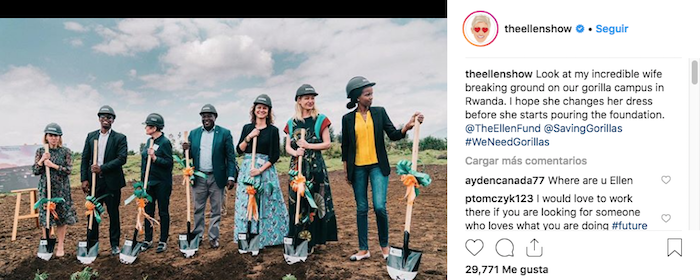 En una ceremonia multitudinaria, Portia de Rossi, esposa de DeGeneres, actriz y filántropa, puso la primera piedra del proyecto, que consistirá en un campus de cinco hectáreas y que servirá de apoyo al trabajo que el Fondo para Gorilas de Dian Fossey ya realiza en la zona.