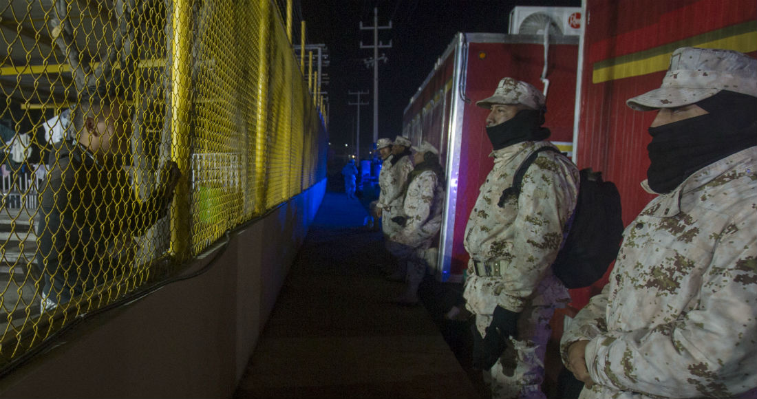 Soldados con uniforme de camuflaje y equipo antidisturbios rodeaban el sábado el exterior de la instalación. Algunos de ellos descansaban de pie recargados sobre sus escudos antidisturbios, mientras los migrantes se arremolinaban en el interior de una cerca de tela metálica de color amarillo. Un helicóptero sobrevolaba el lugar y algunos migrantes subieron a autobuses que los transportarían a otro lugar.