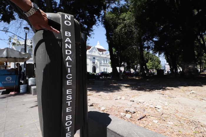 La palabra “vandalizar” fue mal escrita con “b” y no con “v” en los botes de basura del Ayuntamiento de Puebla, por lo que la letra tuvo que se reemplazada.